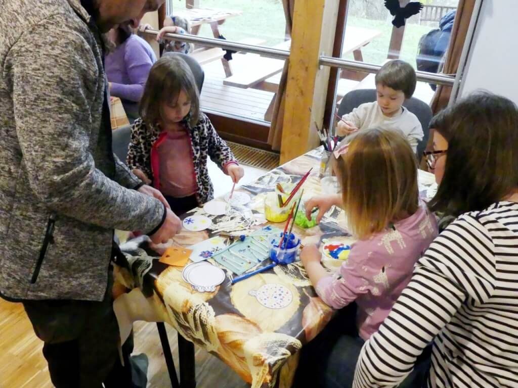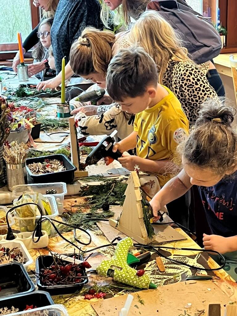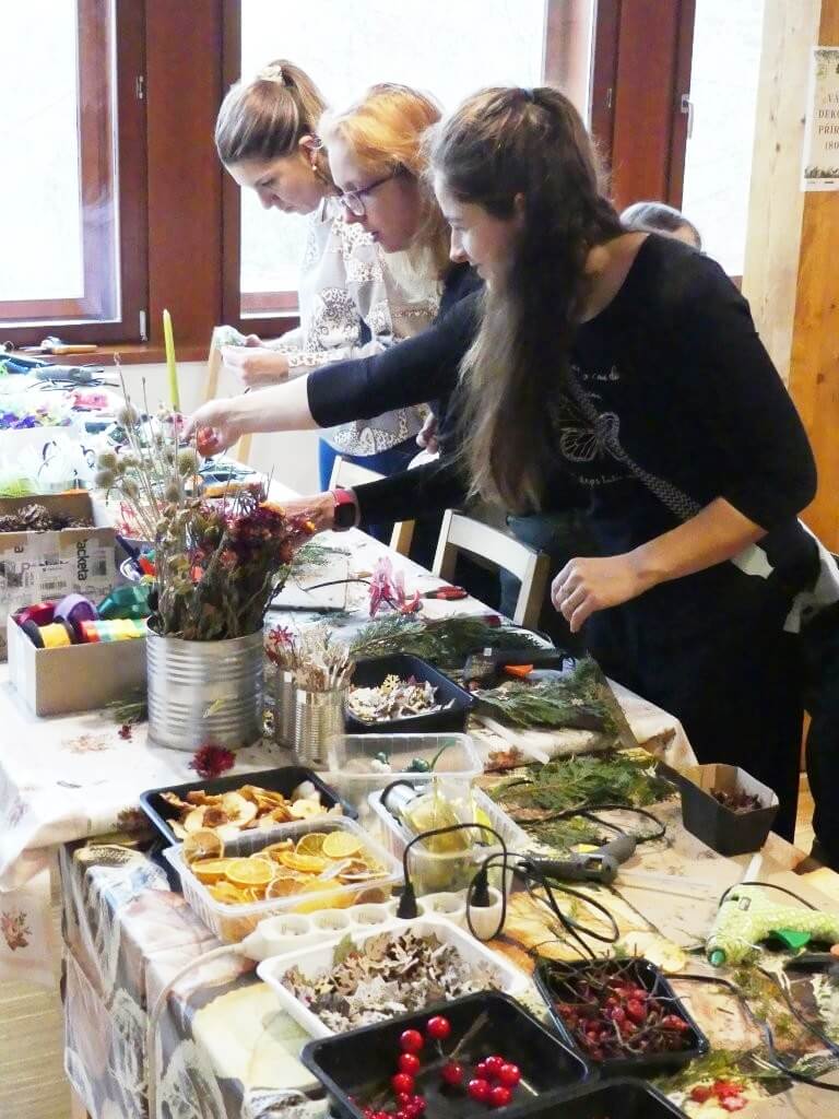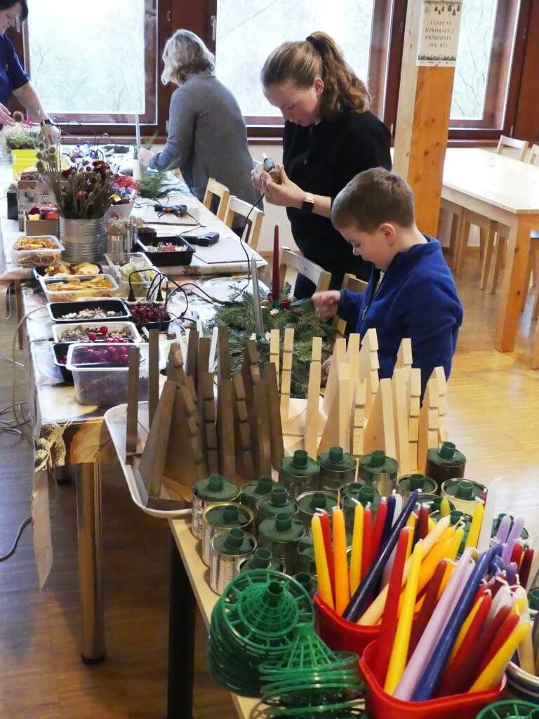 Uvnitř budovy byl připraven pestrý program – vyrábění z papíru, malování dřevěných domků či výroba korálkových ozdob. Nechyběla ani dílnička s přírodninami, kde si návštěvníci mohli vyrobit vánoční dekorace.
